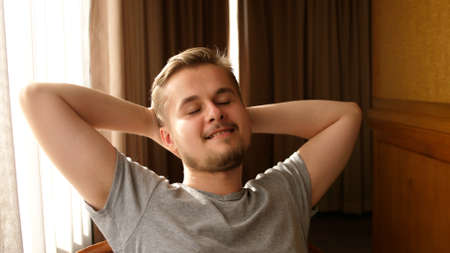 Happy lazy young hansome man relax daydream meditate sit on comfortable sofa at home in living room