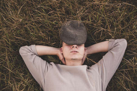 Portrait of a young man of 18 years old, lying in the dry grass, in the rays of the setting sun.