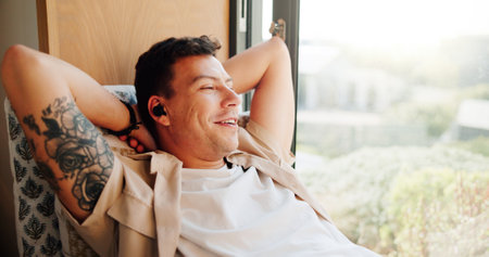 Man, earphones and relax by window in home with smile, memory and reflection with music in morning. Person, ear pods and happy with audio streaming, subscription and thinking on couch at apartment