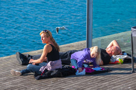 Spain, Barcelona - Jan 01, 2012: People Local and tourists have are rest and relaxing and walk in a leisurely way in a beautiful sunshine warm weather on a seafront Rambla De Mar near Maremagnum mall.