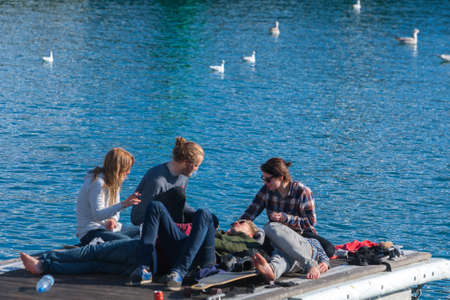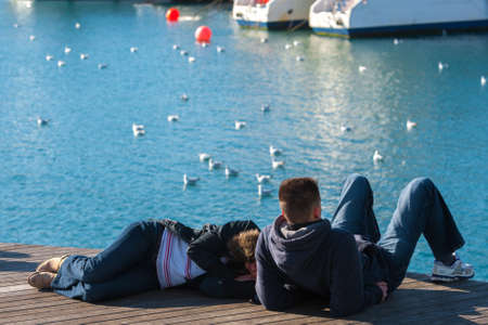 People lay on the pier at sunset Muggia