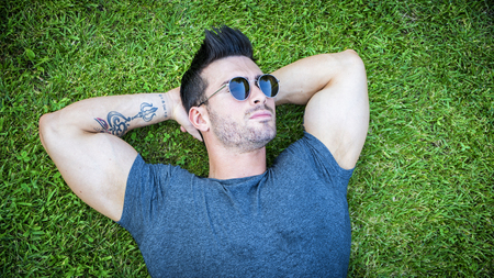 attractive man with sunglasses relaxing on the grass with his hands under the head