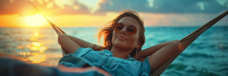 Caucasian woman lying in a hammock at sunset on a tropical beach.