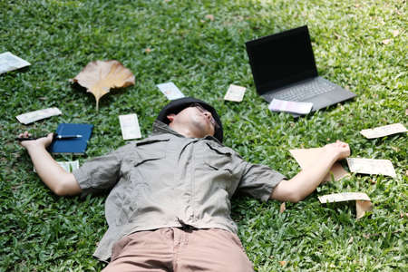 Man sleeping on the grass in the park with a laptop and money
