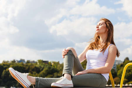 Trendy fashionable woman relaxing outdoor wearing casual footwear white sneakers and hole trousers. Female enjoy sunlight against blue sky.