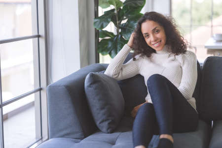 Portrait of beautiful smiling young woman sitting on sofa. Attractive female relaxing at home after hard day.