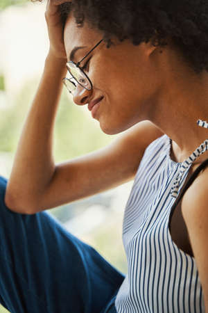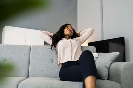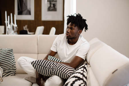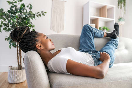 Young Black Woman is Sitting on the Sofa Looking at the window. Black girl disappointed.