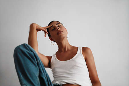 Confident young woman teenager head up aside with closed eyes. Adolescence issues concept.