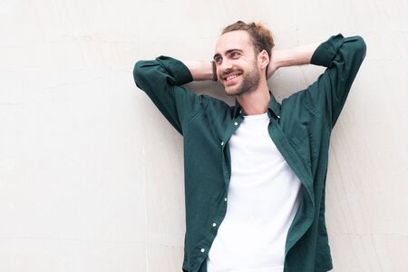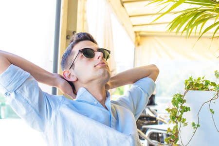 Ethnic Stylish young man white dressed lying near a swimming pool looking on the right