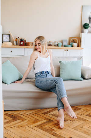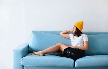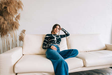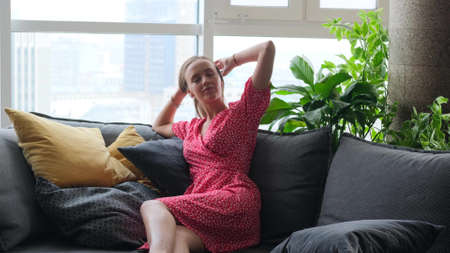 Young beautiful woman moves on the sofa and falls on it, enjoying her lifestyle and freedom.