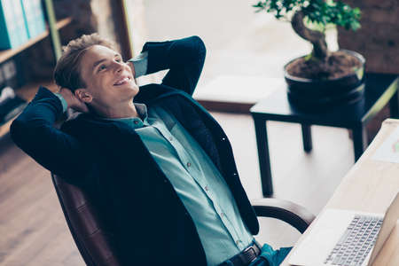 Portrait of cheerful positive guy entrepreneur feel content satisfied calm peaceful sit chair desktop desk table industrial loft studio wear tux tuxedo style stylish trendy.