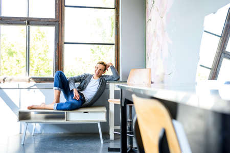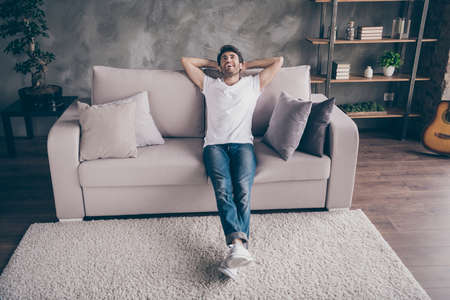 Photo of handsome guy in high spirits holding hands behind head sitting comfortable big couch sleeping relaxing saturday morning in modern flat loft indoors