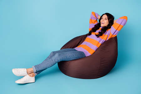 Full length body size view of attractive cheerful girl lying on bag chair resting isolated over bright blue color background