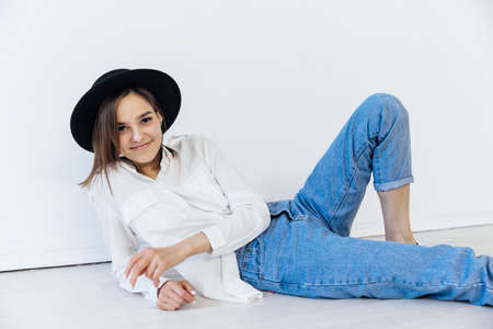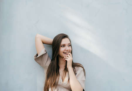 attractive sexy girl posing by a light wall, smiling and looking happy