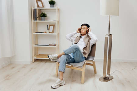 handsome man sweater on the shoulders headphones music sitting in the room interior