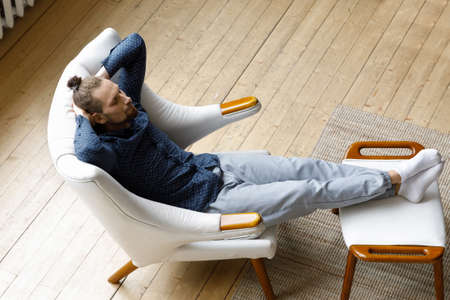 Top above view relaxed young hipster man homeowner daydreaming napping in cozy armchair with legs on ottoman, breathing fresh air, sleeping resting with closed eyes enjoying peaceful moment at home.