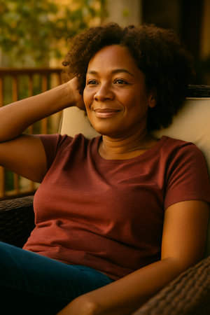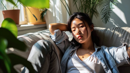 A woman enjoys a moment of relaxation on a plush sofa, sunlight streaming through nearby windows, casting warm shadows on her face and creating a peaceful atmosphere.