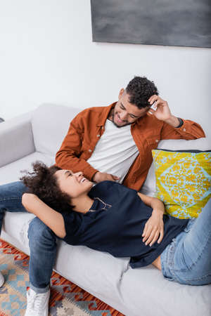 happy young african american couple looking at each other while resting on couch in modern apartment