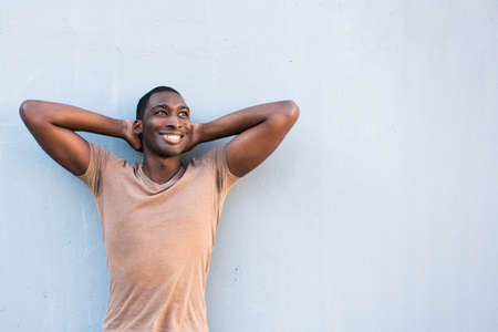 Portrait young black man smiling with hands behind head and looking away by gray background