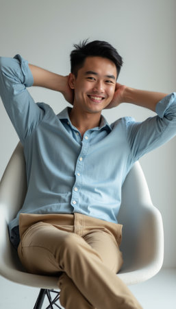 A cheerful young Asian man sits comfortably in a modern chair, exuding confidence and ease with a bright smile. His casual attire and relaxed posture create a warm, inviting atmosphere, perfect for showcasing a sense of tranquility and self-assuredness