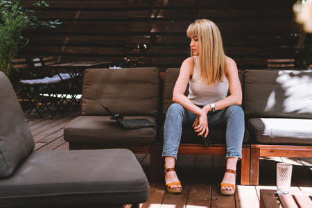 Portrait of a young beautiful woman sitting with a laptop and a phone on the sofa in a cozy work area