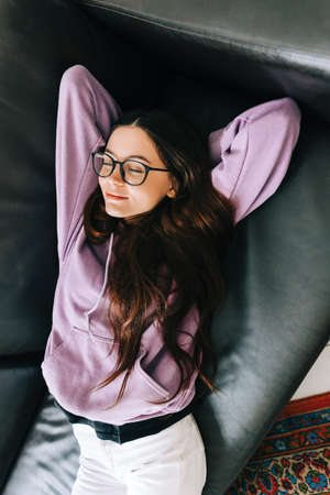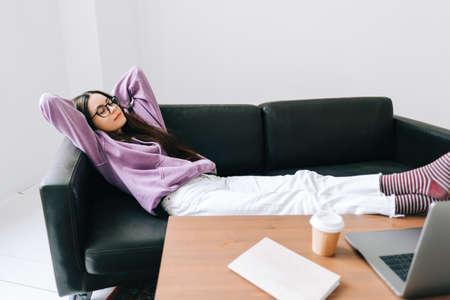 Beautiful young Asian woman, in a sweatshirt, resting on the sofa in the living room, throws her hands behind her head, closes her eyes, relaxes