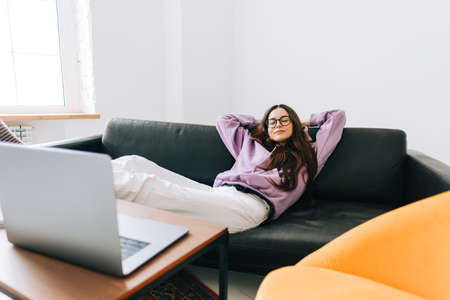Young caucasian woman relaxing on a sofa in front laptop in living room after work.