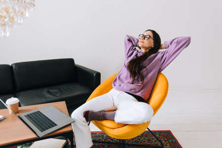 An overworked girl is sitting in a chair, resting, stretching her arms with her eyes closed