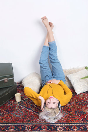 Caucasian woman with blonde hair wearing a yellow sweater and jeans, lying on a patterned rug, listening to music with headphones, legs up on the wall.