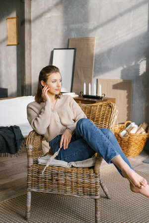 A beautiful young woman in jeans and a jumper sits on a wicker chair by the fireplace at home and dreams