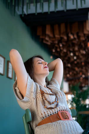 Middle-aged woman in boho clothes with wooden beads sits in cafe with her hands behind her head