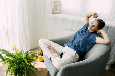 Happy man relaxing on comfortable armchair, smiling calm relaxed guy lounge eyes closed in sunny cozy home.