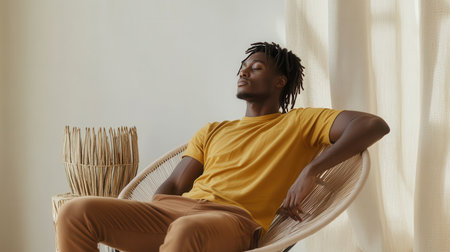 A young man with braided hair sits peacefully in a cozy chair, enjoying the soft natural light filtering through sheer curtains.