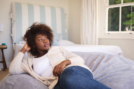 African american woman relaxing in bedroom, lying on bed looking to window. domestic lifestyle, enjoying leisure time at home.