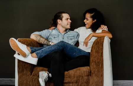 Cute couple in love in the weekend. Happy couple sitting and hugging in a comfortable couch in the living room at home. Enjoying time lifestyle concept.