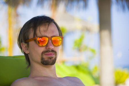 Blond man is resting at the lake at sunlight in summer.