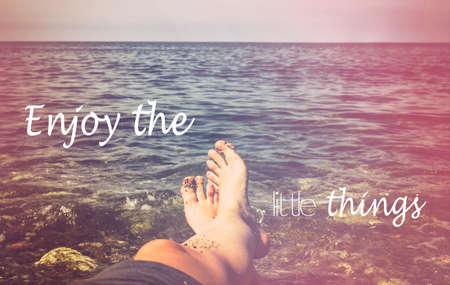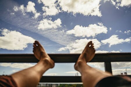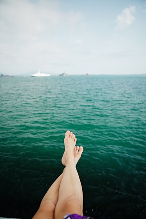 Closeup image of man's legs and foot while sitting by the sea with blue sky background