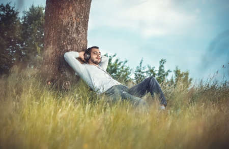 Young man listen music - enjoy - repose in grass. Guy leaning against a tree relaxing - resting. Outdoors - outside. No worries
