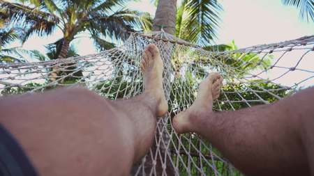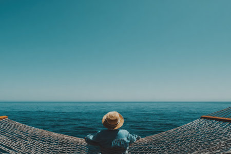 A person relaxes in a hammock, facing the vast ocean under a clear blue sky. The image features a wide shot with a focus on the person, hammock and the sea. The bright composition highlights textures and colors, suggesting outdoor recreation. This photo is suitable for travel, leisure, or lifestyle concepts.