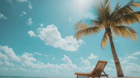 A sunlit lounge chair sits on a sandy beach beside a tall palm tree under a clear blue sky with fluffy clouds.
