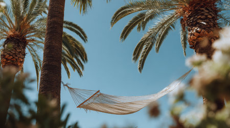 Serene beach scene featuring cozy hammock suspended between palm trees, overlooking tranquil turquoise sea. soft sand and clear sky create perfect tropical getaway atmosphere