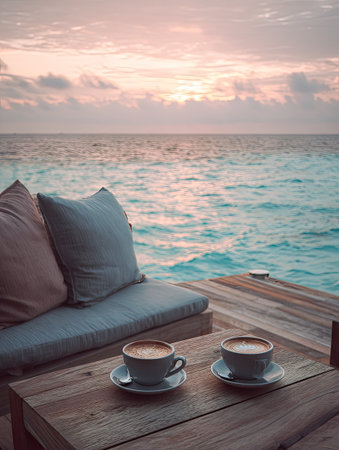 Two cups of coffee sit on a wooden table, with cushions in the foreground and the ocean and sky visible. The scene is bathed in soft, warm light, suggesting either sunrise or sunset. This image could be used for lifestyle, travel, or relaxation-themed projects.
