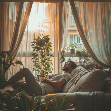 Young man relaxes at cozy home on couch by window. Happy man resting on sofa near window with beautiful curtains in living room, generative ai illustration