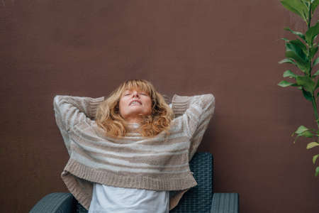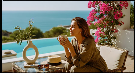 A serene woman relaxing on a couch with a cup of coffee outdoors