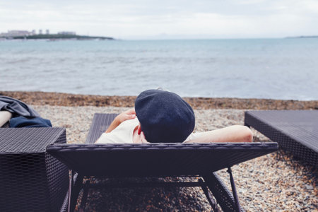 Young man in casual clothes and a cap is lying on a black wicker chaise longue on the seashore. A man is resting and relaxing on a sandy beach. Beautiful seascape in cloudy weather. Copy space.