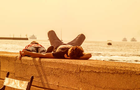 Legs on beach. Foot spa. A young loving couple hugging and kissing on the beach at sunset. Two lovers, man and woman barefoot near the water. Summer in love
