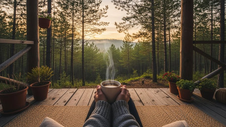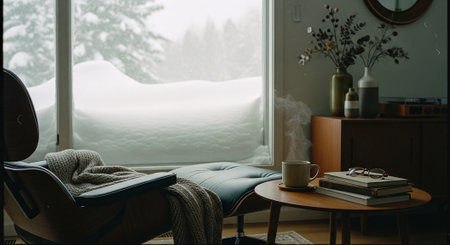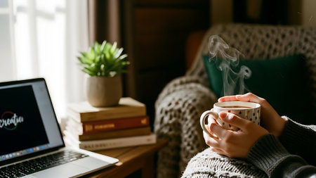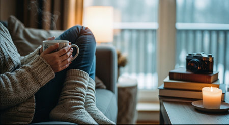 A cozy indoor scene featuring a person holding a steaming mug, sitting on a sofa with knitted sweater and warm socks, surrounded by books and a candle, with soft lighting and a window view