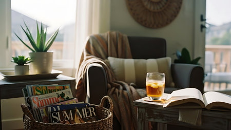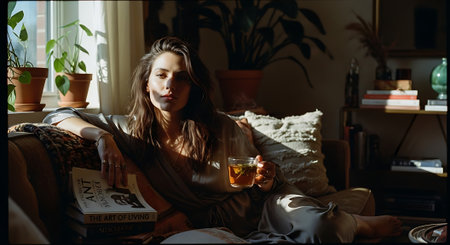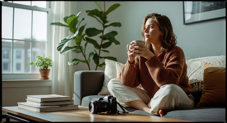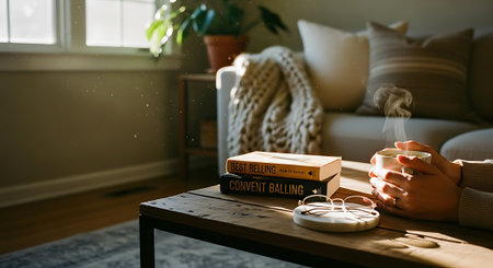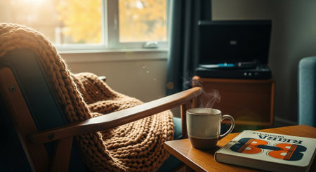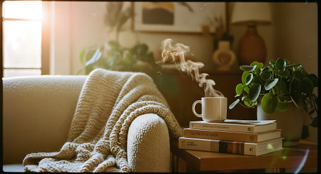 A serene living room scene featuring a beige couch with a knitted blanket, a wooden side table with a stack of books, a steaming white coffee cup, and a potted plant, bathed in warm sunlight.