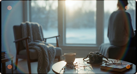 A cozy living room scene featuring a knitted blanket on a sofa, a wooden coffee table with a steaming cup, and a small vase with a pine sprig, sunlight streaming through a window