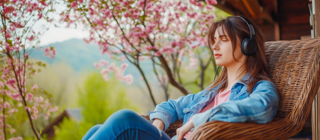 A young European woman wearing headphones is sitting in a rattan armchair, the veranda of a rustic house, enjoying music against the background of spring flowering trees